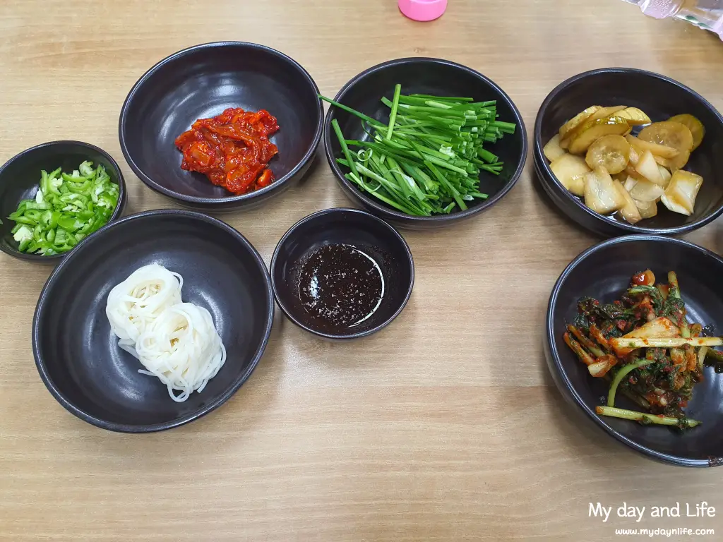 소면과 오징어젓갈, 부추, 양파 간장 절임 그리고 김치 종류가 하나 나옵니다.